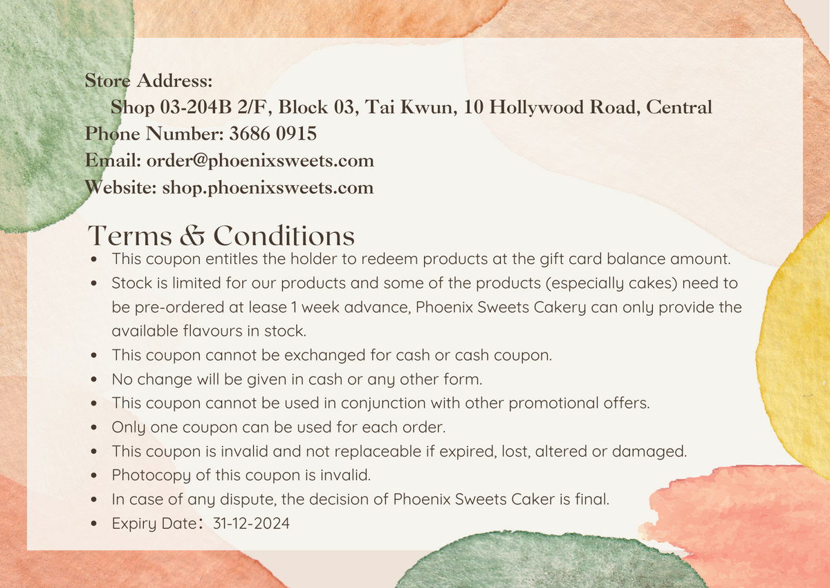 Please arrange to pick up the sweets at our studio in Lai Chi Kok or Tai Kwun Store in Central.