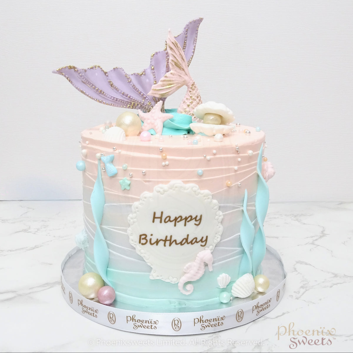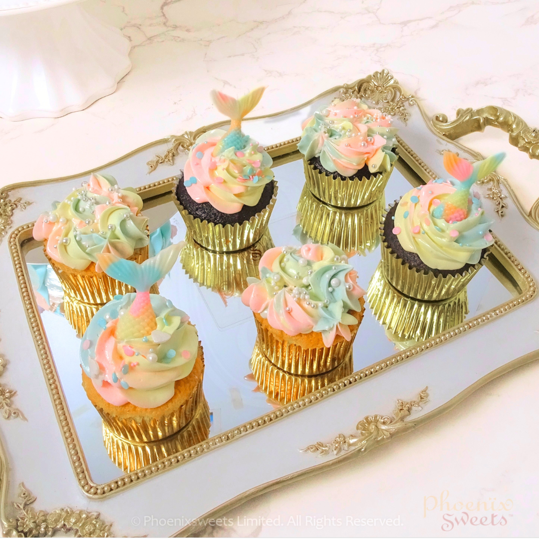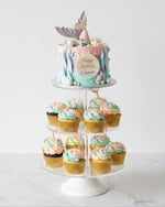 The combo includes a Mermaid cake and 18pcs Mermaid cupcake with loan of a transparent acrylic cupcake tower ($500 refundable deposit is payable for loaning the tower).