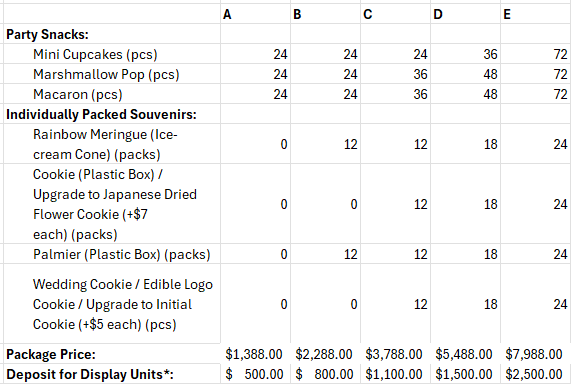 | Wedding Cookie / Edible Logo Cookie / Upgrade to Initial Cookie (+$5 each) (pcs) | - | - | 12 | 18 | 24 |